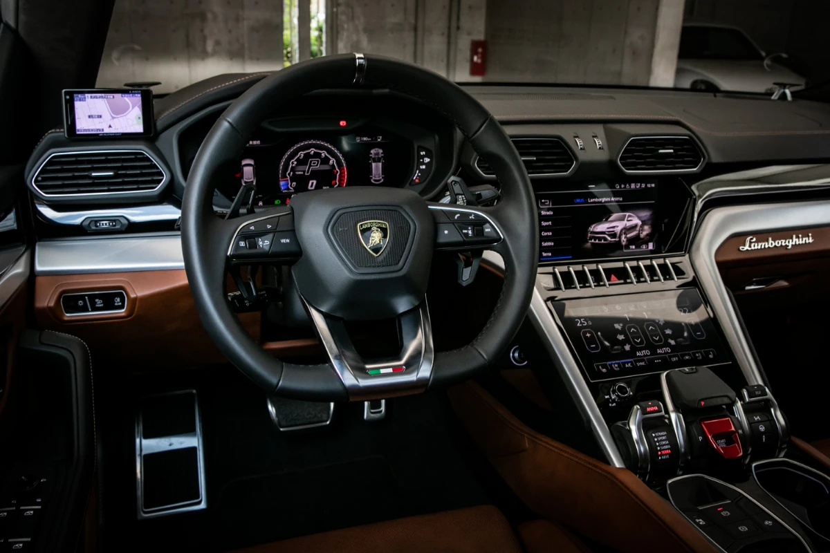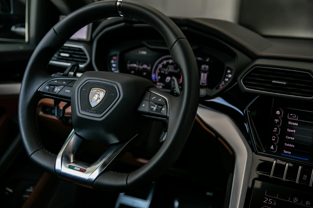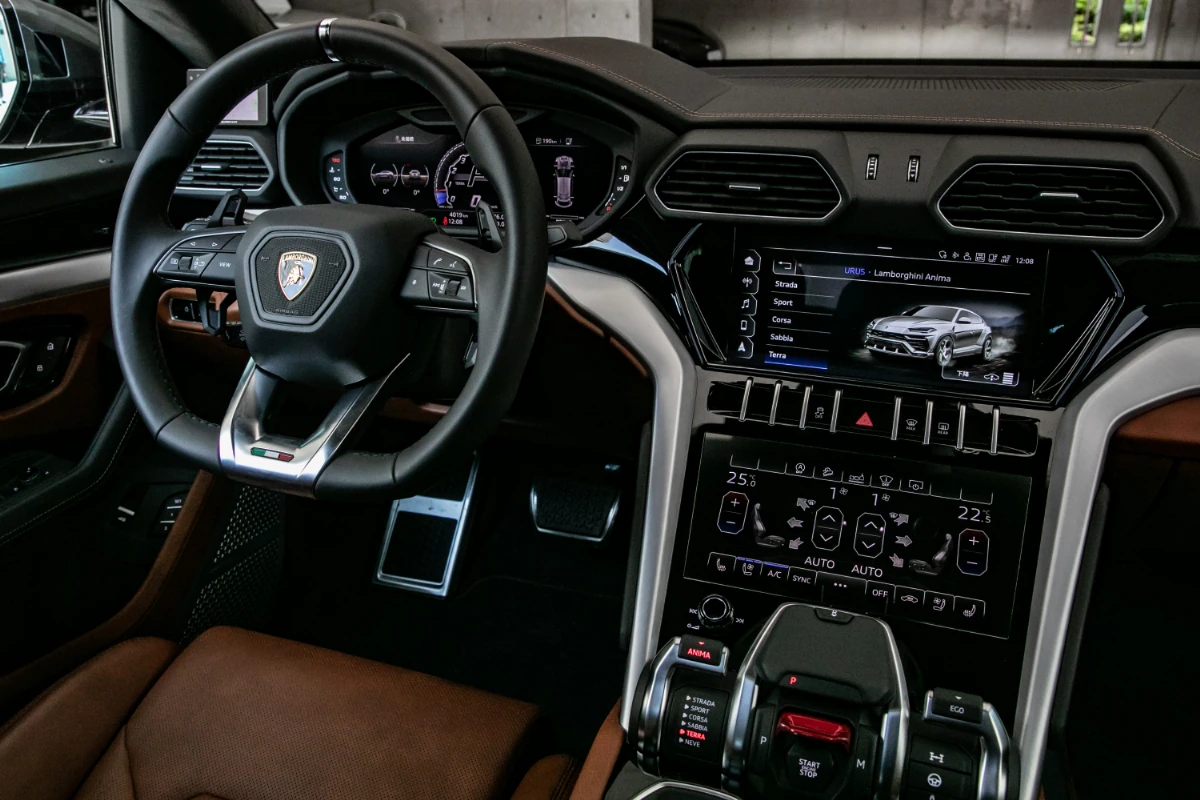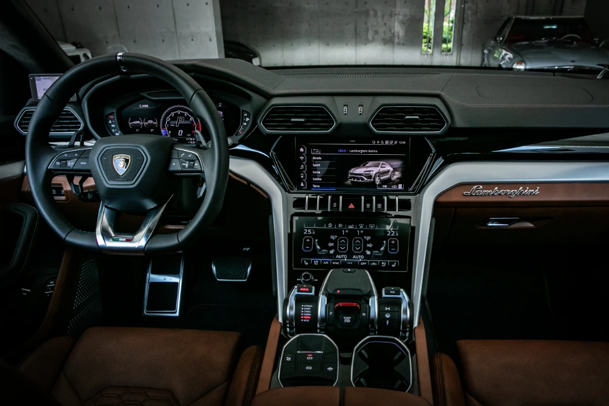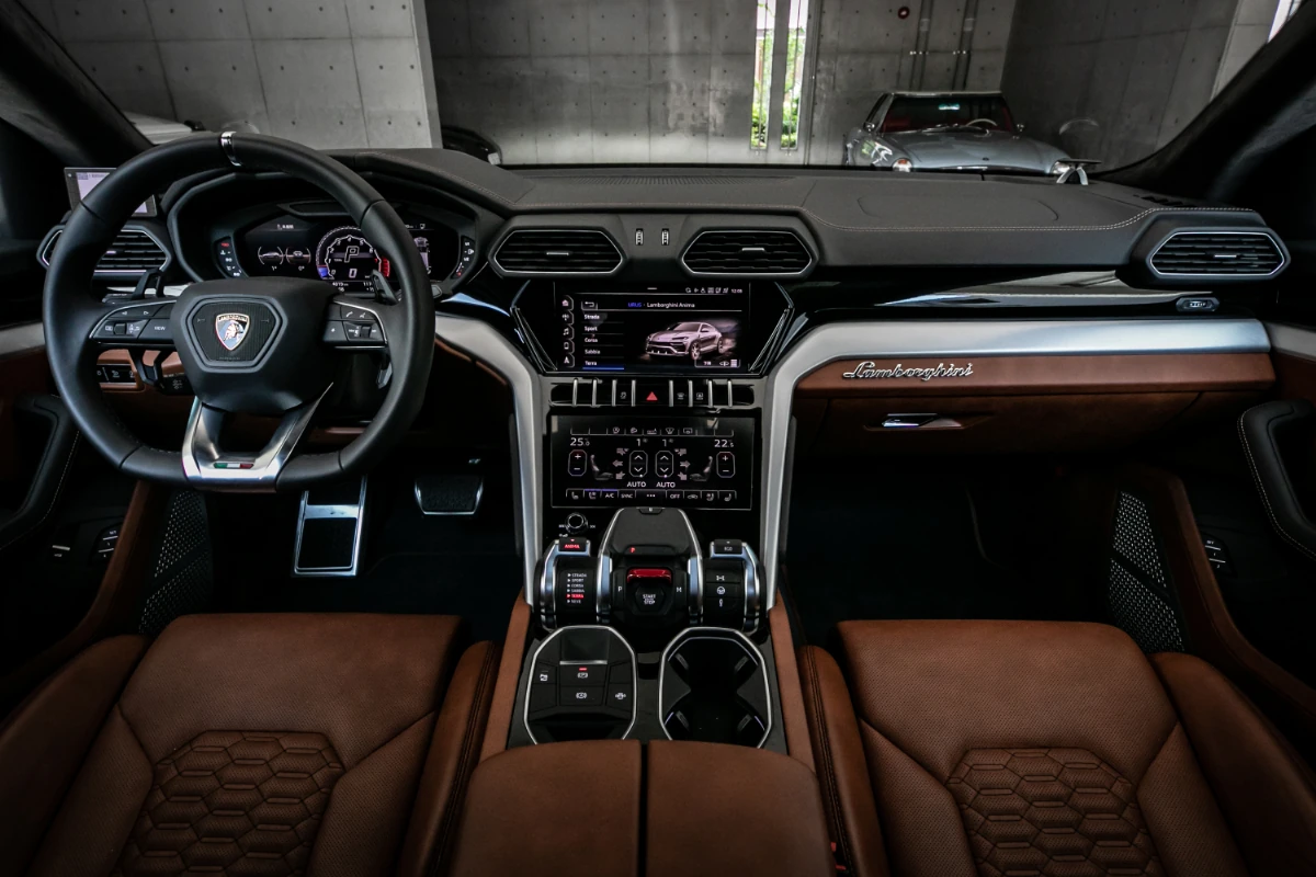 The Lamborghini Urus is a luxury SUV that seamlessly combines high-performance features with mature and refined elegance. From its glistening gunmetallic exterior to the sophisticated brown leather interior, it's a distinctive and captivating vehicle.