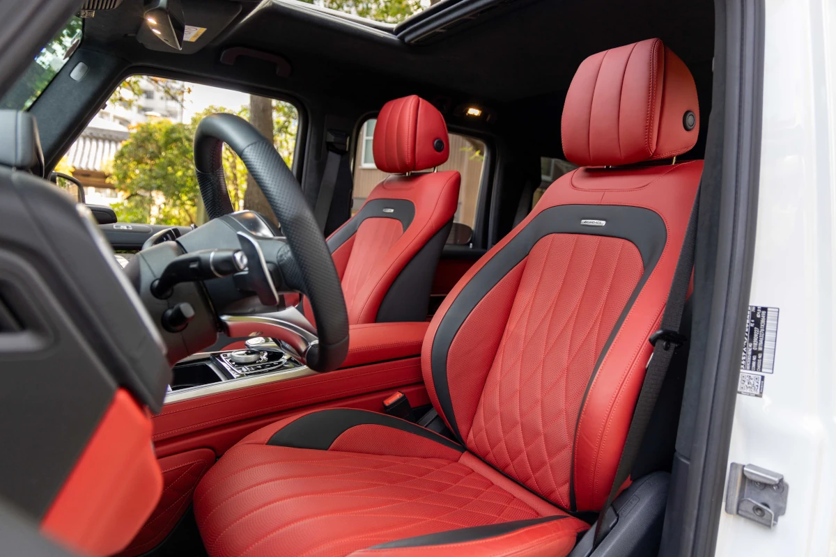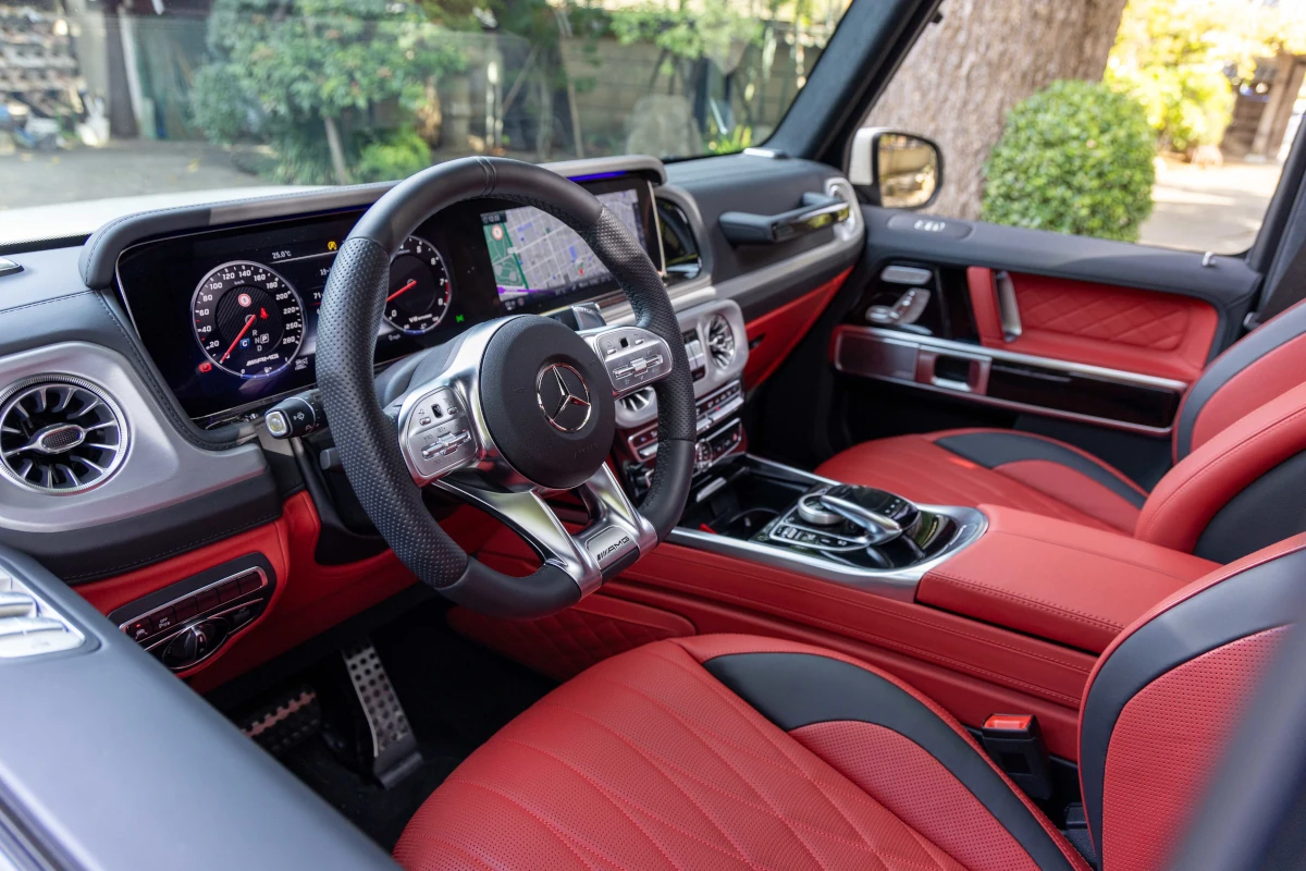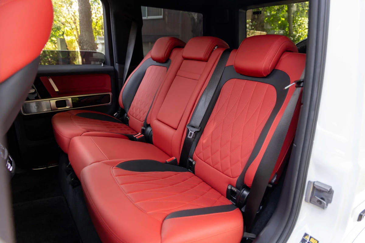 The Mercedes-Benz G63 combines a sleek white exterior with a luxurious red interior, offering a powerful V8 engine and advanced technology in a compact, elegant package.