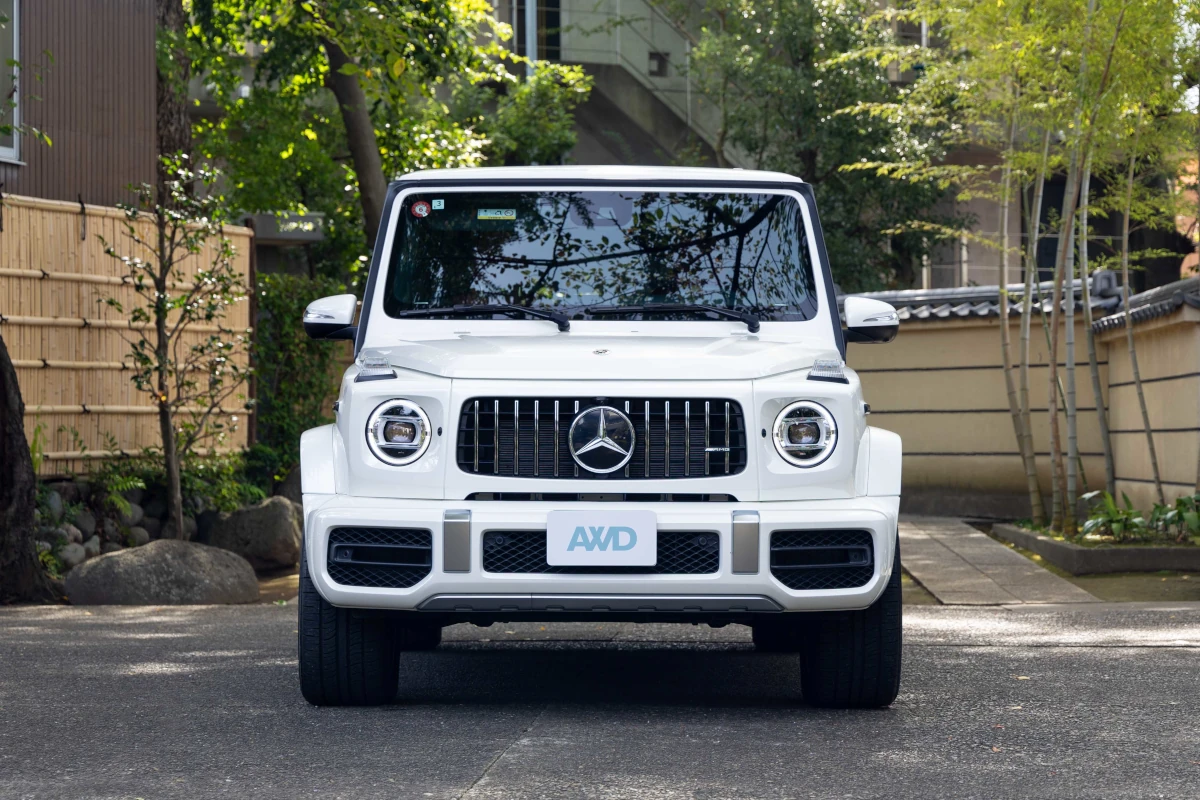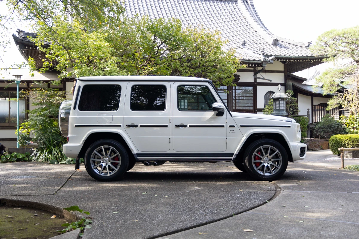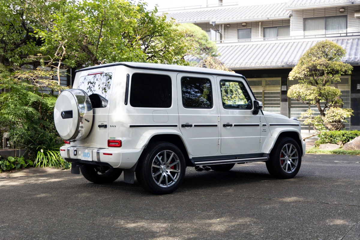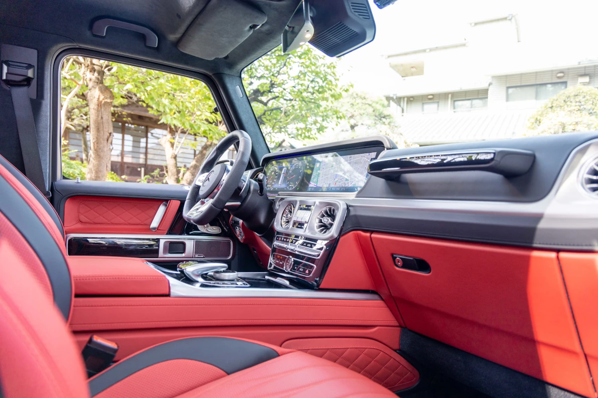 The Mercedes-Benz G63 combines a sleek white exterior with a luxurious red interior, offering a powerful V8 engine and advanced technology in a compact, elegant package.