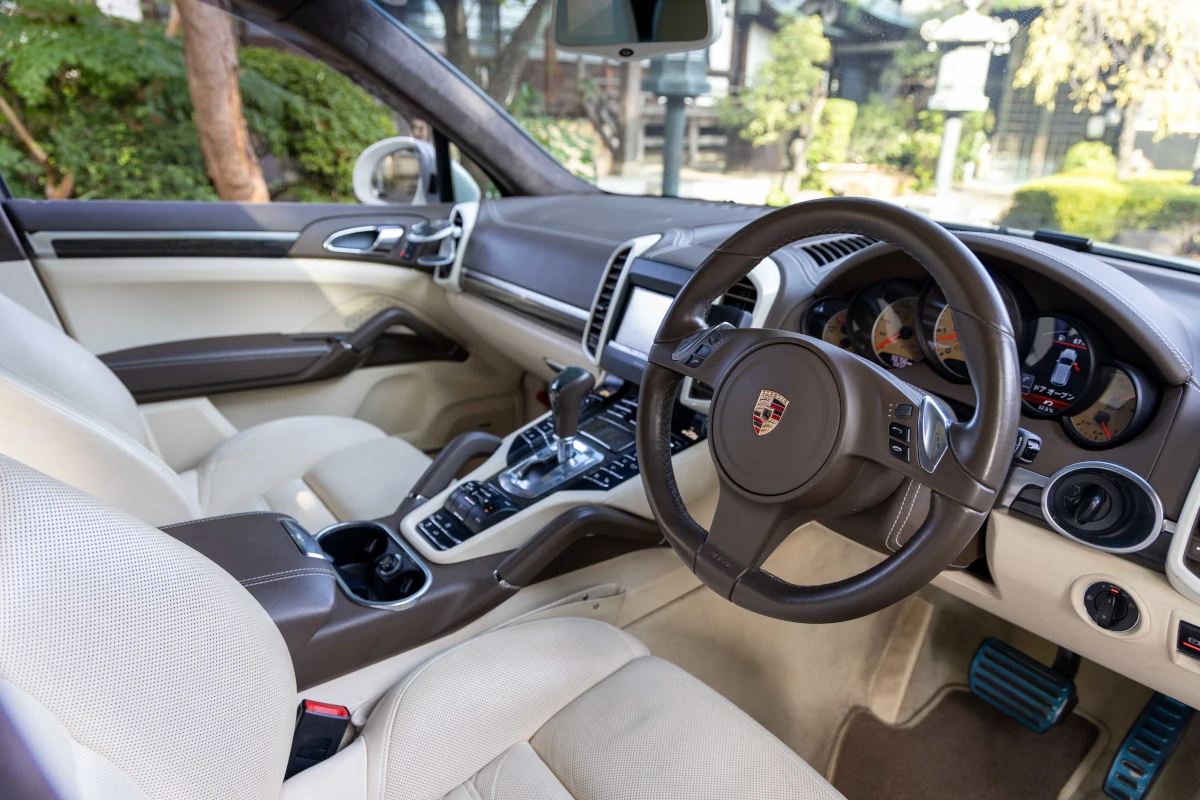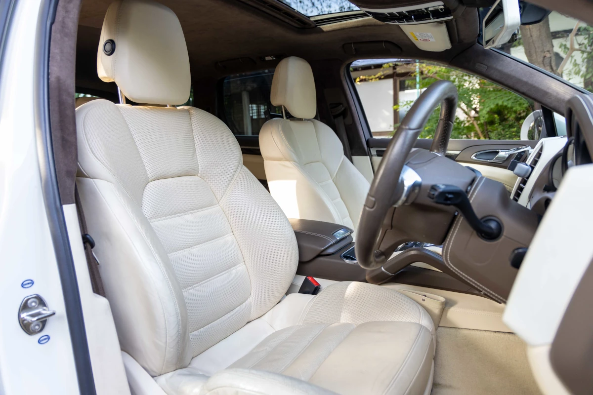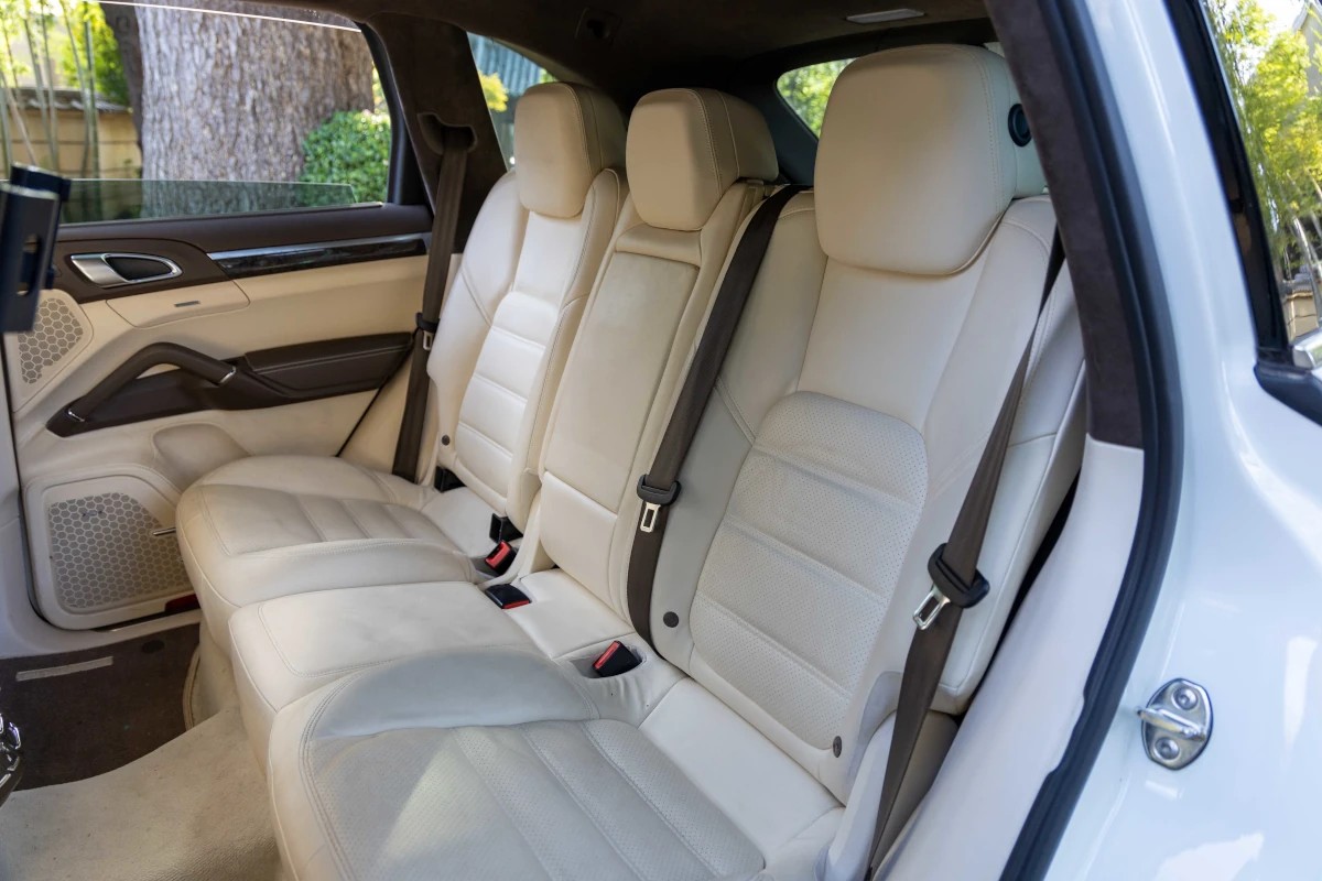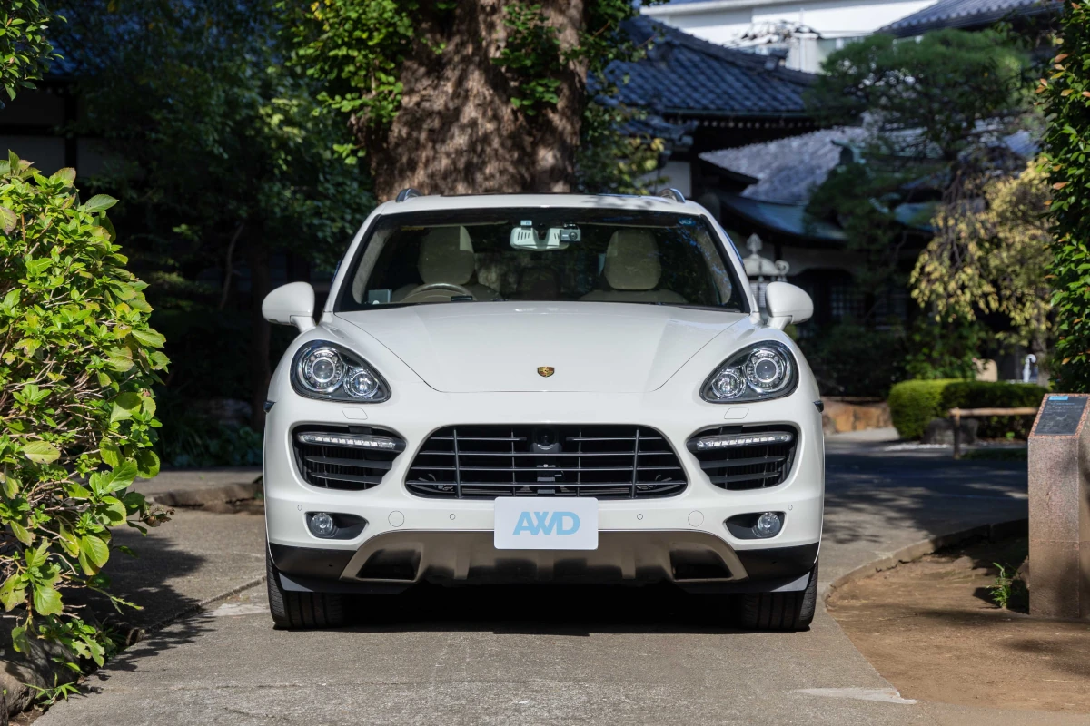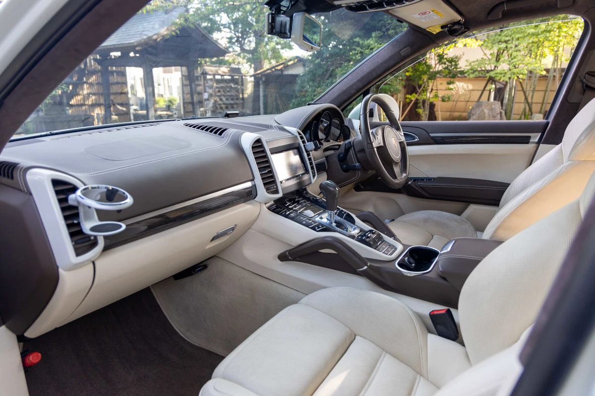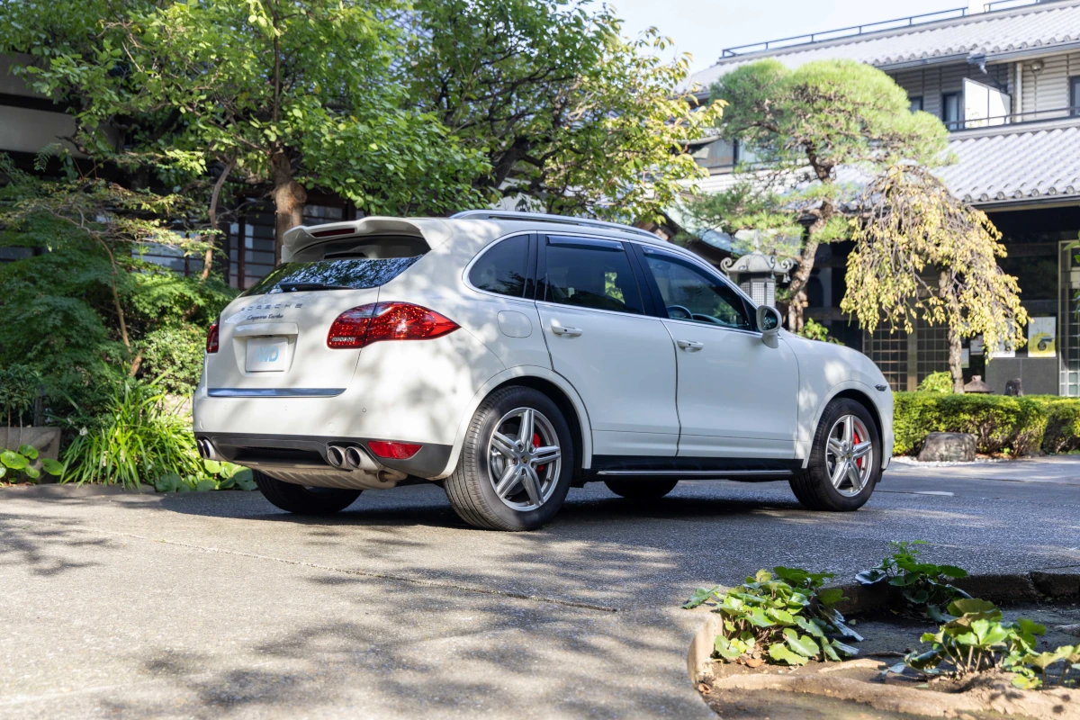 The 2014 Porsche Cayenne Turbo: A pinnacle of luxury and performance with a stylish Pearl White finish, a potent twin-turbo V8 engine, and a high-tech, luxurious cabin.