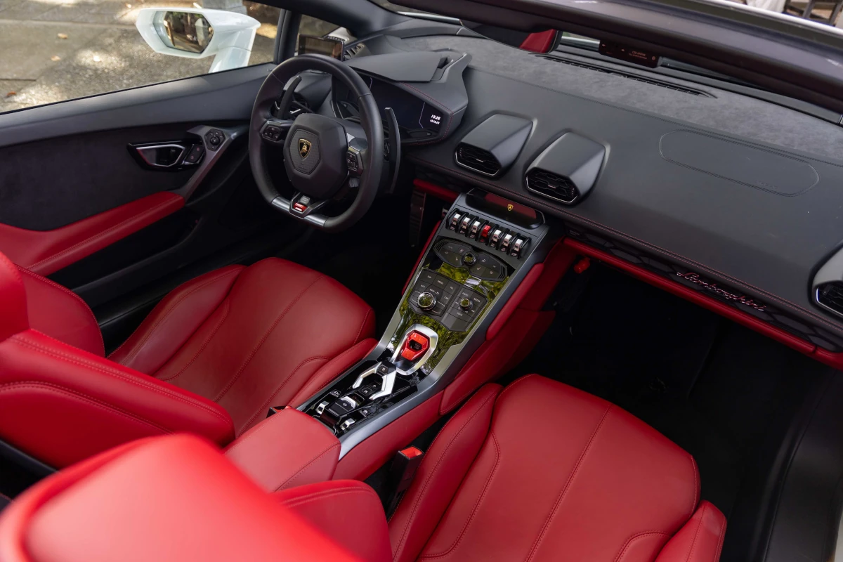 The Lamborghini Huracan Spyder is a captivating car that combines elegance and power. Its white body, wine-red seats, and open-top design exude sophistication. With a high-performance engine and exceptional handling, it promises an exhilarating driving experience. Whether you're cruising or taking on thrilling drives, the Huracan Spyder offers both luxury and sportiness, making it an enticing car